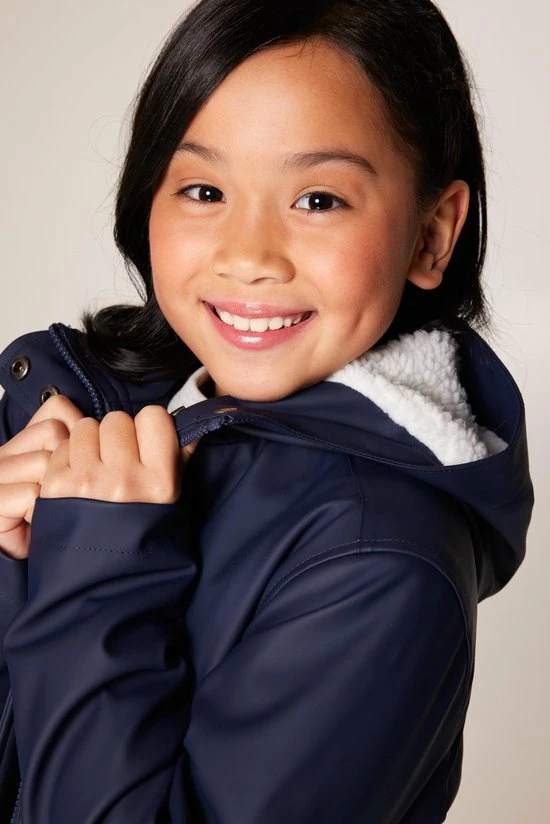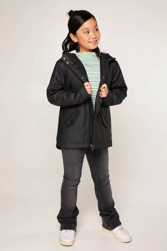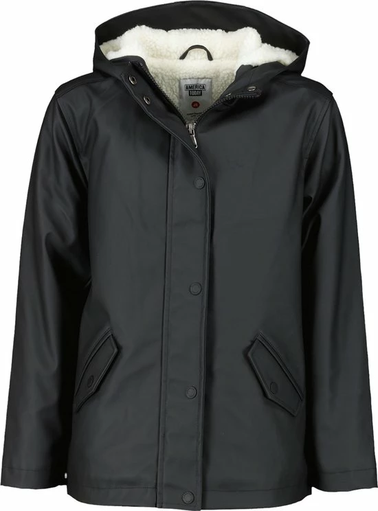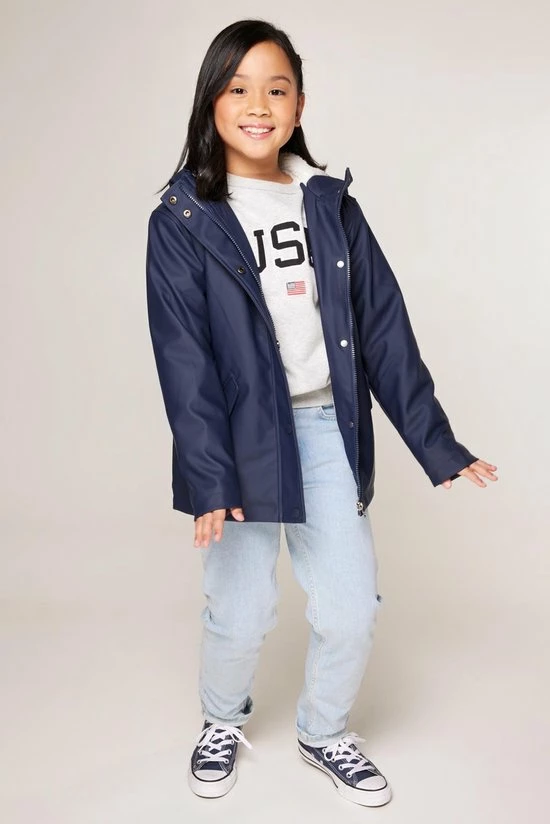 America Today kinder regenjas. De Janice Teddy Jr maakt het voor jongens en meisjes dé perfecte regenjas. Deze regenjas is spatwaterdicht, gevoerd met teddy voering, knoop- en ritssluiting en is voorzien van een capuchon. Ook heeft deze twee steekzakken met klep- en drukknootsluiting, binnenzak met drukknoopsluiting en naamlabel aan de binnenzijde. Alle drukknopen zijn rubberized, de binnenkant van de capuchon is van self-fabric.