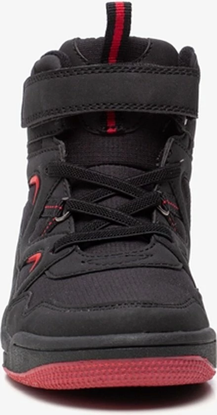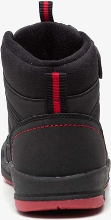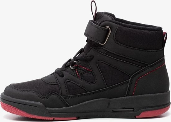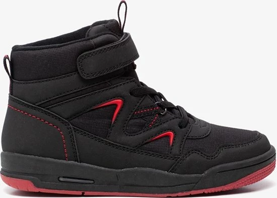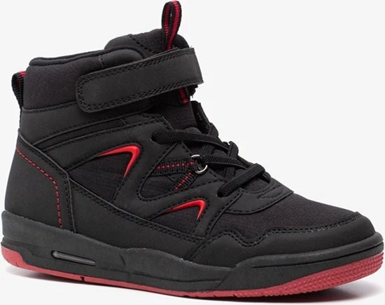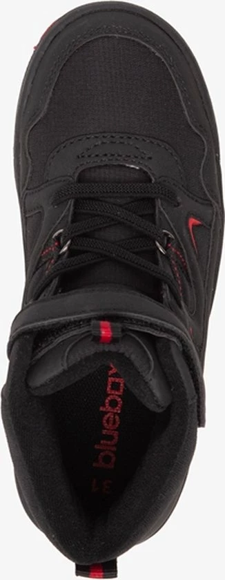 Zwarte sneakers voor jongens van Blue Box. Gemaakt van imitatieleer en textiel, een binnenwerk van textiel en een stevige profielzool. De sneakers hebben elastische veters met klittenbandsluiting en een aantreklusje op de hak voor een makkelijke instap. Het vaste voetbed is gemaakt van textiel. De sneakers hebben een zwarte profielzool met een rode onderzijde.