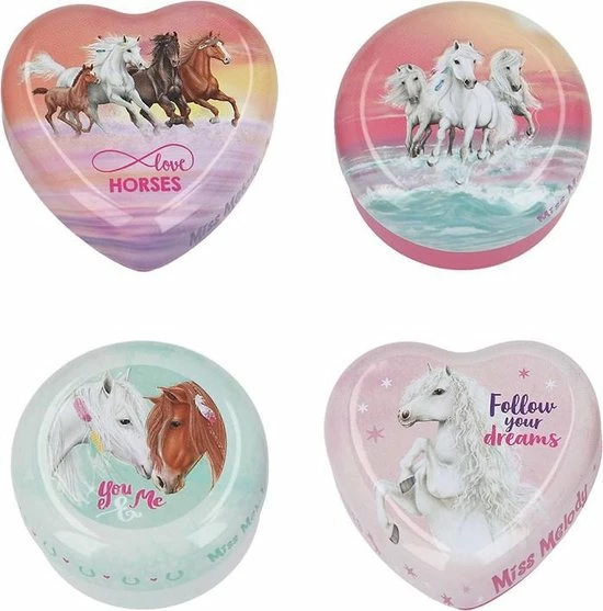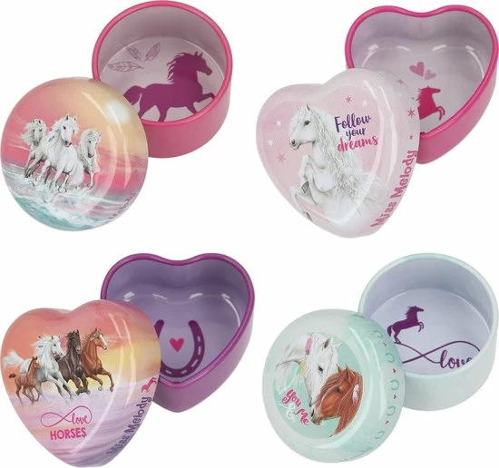 Klein, maar paardenfijn: hartvormige en ronde blikken doosjes met vier toffe motieven van Miss Melody! Een veilig plekje voor bijvoorbeeld melktanden of andere kleine schatten.