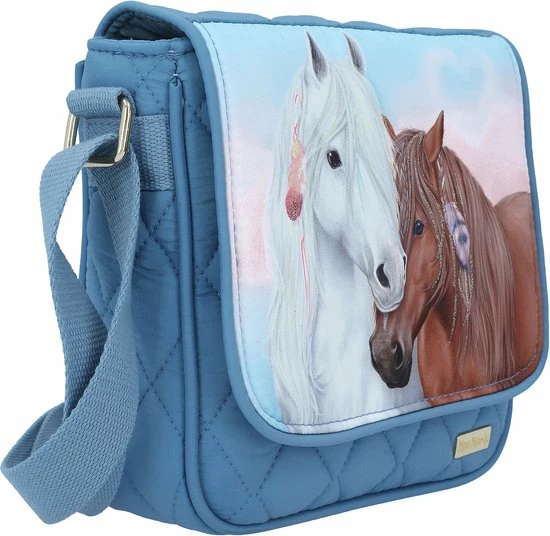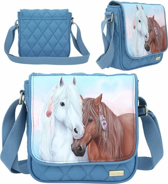 De kleine lichtblauwe schoudertas van Miss Melody heeft een trendy quiltmotief en een prachtige XL paardenafbeelding met glitter op de voorkant. De bijpassende band is in lengte verstelbaar. Het hoofdvak sluit met een magneet en het binnenvakje heeft een rits. Materiaal: 100 procent polyamide, 100 procent polyester: voering 100 procent polyester.