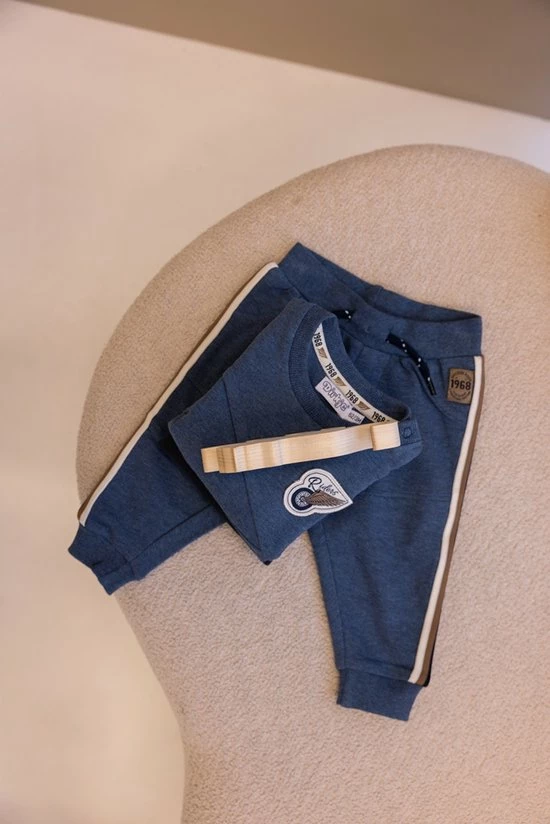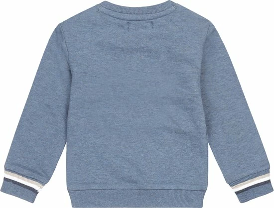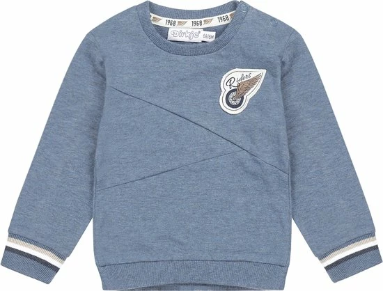 Een fijne trui mag niet ontbreken in de kledingkast van je kleintje. Deze Dirkje jongens trui in gemeleerd blauw zit lekker comfortabel door het stretch in de zachte katoen. De sweater heeft mooie siernaden op het voorpand en is afgewerkt met een stoere applicatie op de borst . Een leuk detail is de boord in verschillende kleuren aan de mouw. De maatjes tot en met 86 sluiten met drukkers op de schouder.