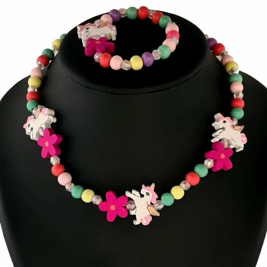 Een vrolijke kinderketting en kinderarmband, gemaakt van houten kralen en bedeltjes, acryl kralen en elastiek.