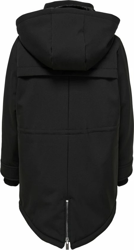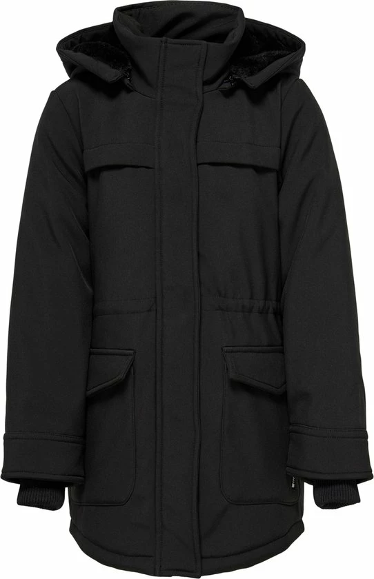 Lange parka jas van ONLY GIRLS. De jas heef 2 voorzakken met klep en rib boorden onderaan de mouwen. De achterkant is iets langer dan de voorkant.