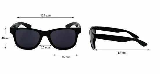 Breedte van de bril 12,5cm, breedte van de lens 4,5cm, hoogte lens 3,5cm