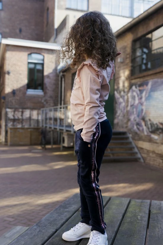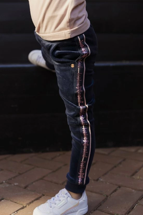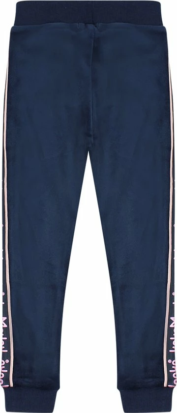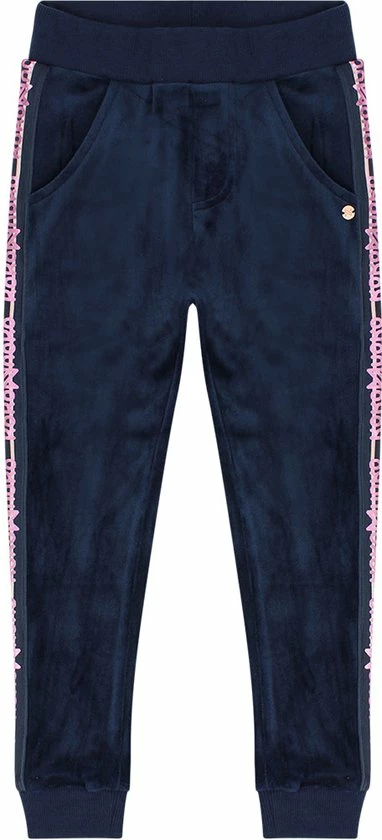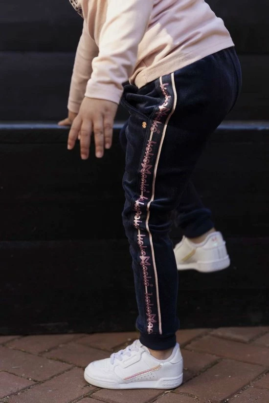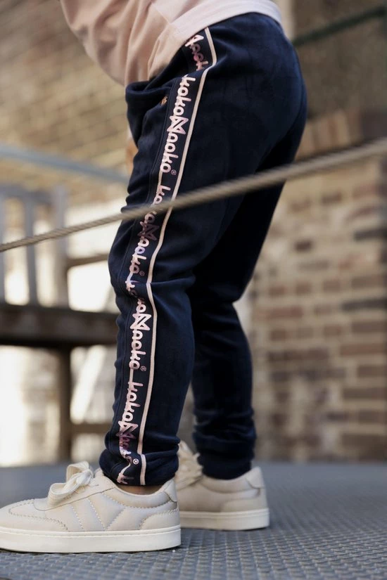 In deze Koko Noko joggingbroek kan heerlijk gespeeld worden! De donkerblauwe broek is gemaakt van een superzacht velours stof, hij heeft steekzakjes en een boord in de taille en onderaan de pijp. De bies aan de zijkant heeft roze Koko Noko letters met een leuk glansje. Samen met de bijpassende Koko Noko sweater is dit dé perfecte buitenspeelset!