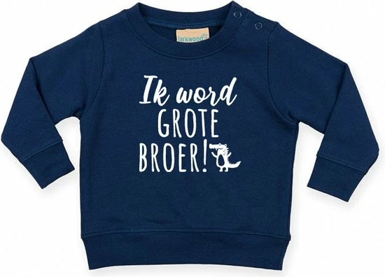 Mooie, donkerblauwe sweater met ronde hals en drukknoopjes op de schouders. Met witte print “Ik word grote broer” en een vrolijke krokodil. Leuk om te gebruiken als zwangerschapsaankondiging. Gemaakt van 80% katoen en 20% polyester, met zachte fleece voering.