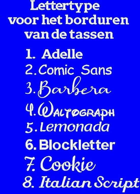 - Na uw bestelling sturen wij u een mail uit welke lettertypes en kleuren u kunt kiezen voor het borduren van deze leuke zachte tedy rugtas (keuze uit meer dan 500 kleuren).