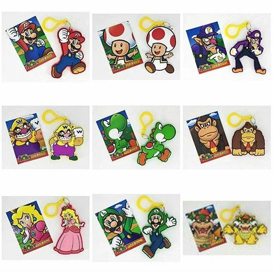 Eén pakje met 1 hanger en 1 trading card. Bevat één van de 9 willekeurige karakters uit de Super Mario serie.