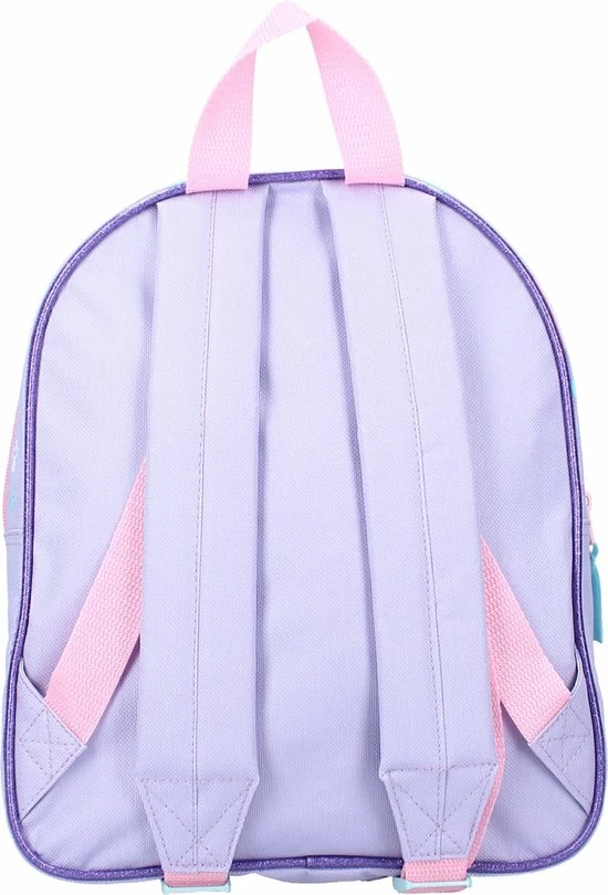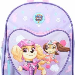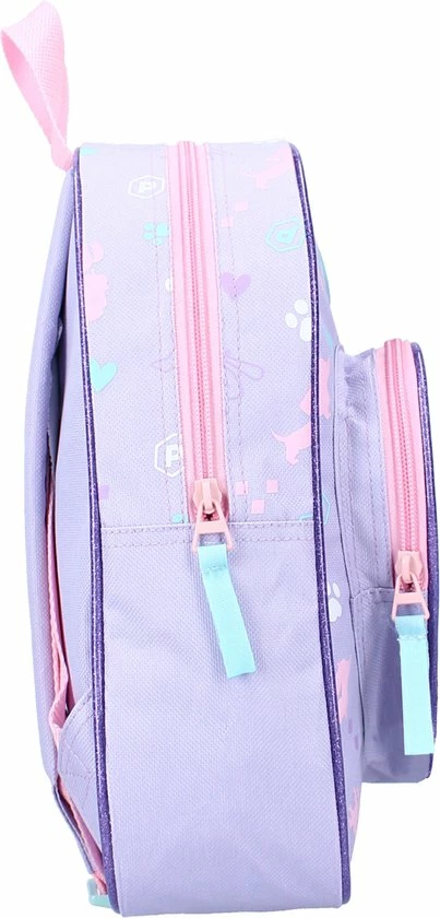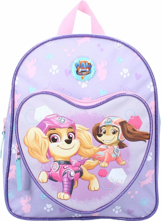 Deze roze Paw Patrol rugzak heeft leuke paarse accenten. Kijk eens naar de paarse rits rand. In het midden rennen Skye en Liberty naar je kleintje toe en beschermen alle spullen die je in de rugzak stopt. In het hoofdvak passen de grotere spullen, zoals de broodtrommel voor school of extra kleren voor de kleuterschool. In de voorzak kun je wat kleinere dingen stoppen. De rugzak kan worden gedragen en opgehangen dankzij de roze lus aan de bovenkant. De schouderriemen zijn in lengte verstelbaar en gewatteerd.