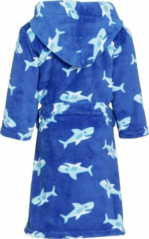 Blauwe badjas/ochtendjas met haaien print voor kinderen. Zachte fleece badjas met een capuchon, ceintuur, twee steekzakken en een handige knoop op borsthoogte zodat de badjas niet af valt. Materiaal: 100% polyester, met Oeko Tex keurmerk. Dierenprint kinder badjassen.