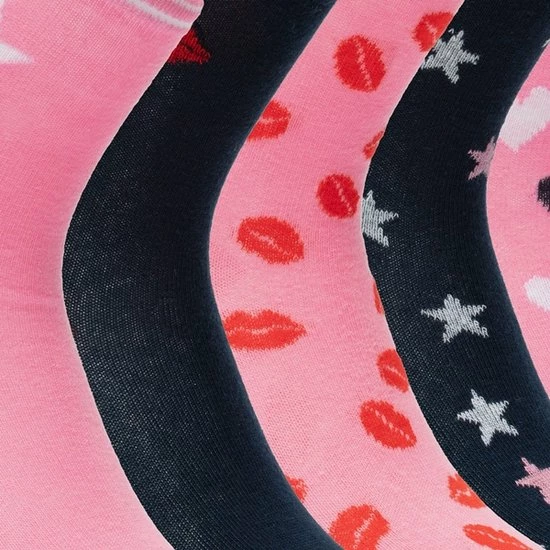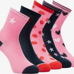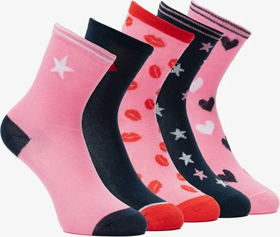 Vijf paar middellange sokken voor kids in de kleuren roze en zwart. Voorzien van hartjes, sterren en kusmondjes. De sokken zijn gemaakt van 75% katoen, 22% polyester en 3% elastaan.