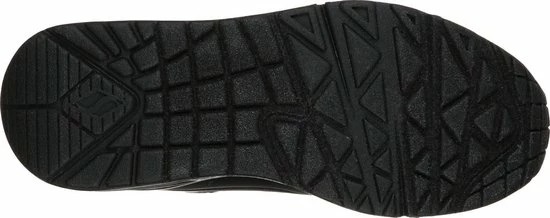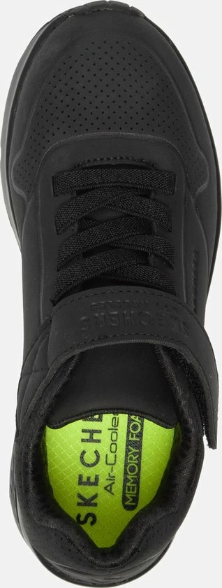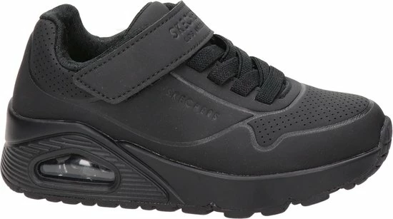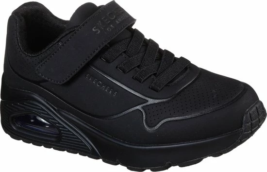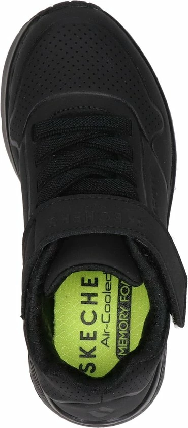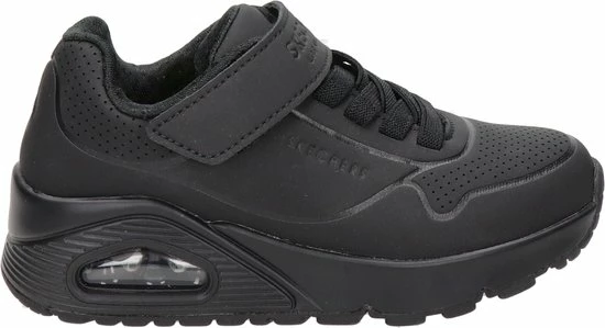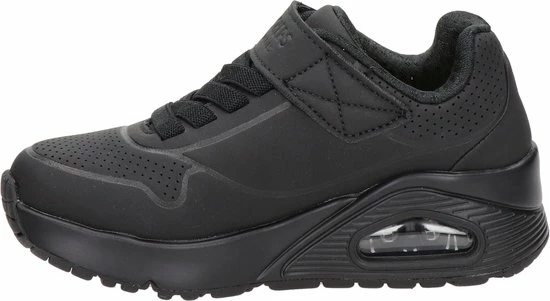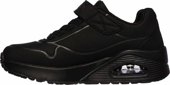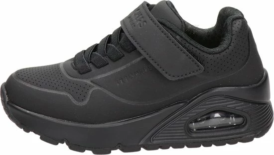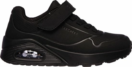 Sportieve zwarte Skechers Uno Air Blitz sneakers, gemaakt van textiel. De comfortabele binnenzool en de voering zijn ook gemaakt van zacht textiel. De sneakers worden gesloten door middel van een vetersluiting. Het klittenbandje zorgt voor extra stevigheid. Dankzij het dempende voetbed met Air-Cooled Memory Foam lopen de schoenen extra comfortabel en hebben ze een ademende werking. De tussenzool met zichtbaar luchtkussen absortbeert schokken bij iedere stap. De zwarte Skechers Uno Air Blitz sneakers hebben een vast voetbed.