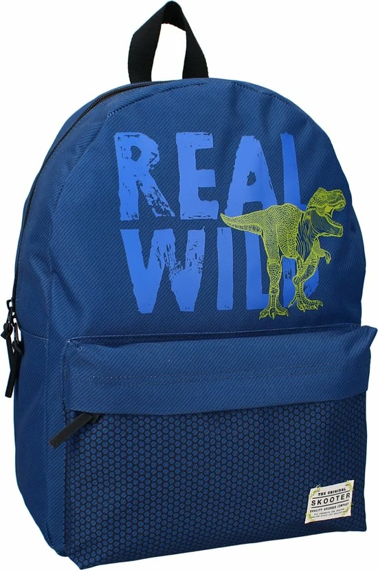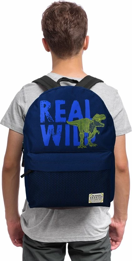 Deze donkerblauwe rugzak van Skooter heeft een grote dino op de voorzijde met daarbij de tekst “REAL WILD”. De tas is uitermate geschikt voor wat oudere kinderen om mee naar school te nemen. De rugzak is ruim en ideaal om lunch, schoolboeken en verdere schoolspullen in mee te nemen. Het voorvak is ook groot, en handig om spullen in te doen die je vaak nodig heeft. De verstelbare schouderbanden zijn heel comfortabel in gebruik. Aan de zwarte lus aan de bovenkant is de tas ook mee te nemen of op te hangen.