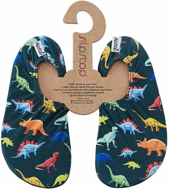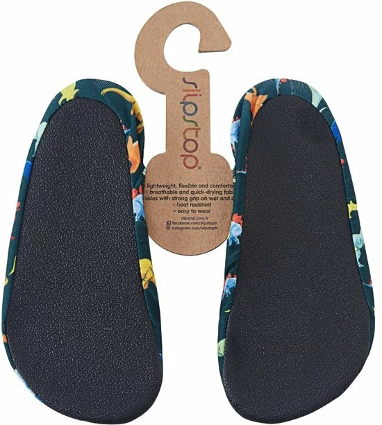 Slipstop Dino – Donker blauw groen met dinosaurussenDe Slipstop Dino is één van de hardlopers van Slipstop. Door de dino’s is een van de lieverlings waterschoenen jongen gok ik.