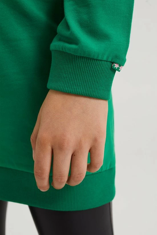 Een regular fit jurk van katoen met toegevoegde stretch, een pailletten applicatie en een embroidery op het voorpand. Het model heeft een ronde hals en lange mouwen.