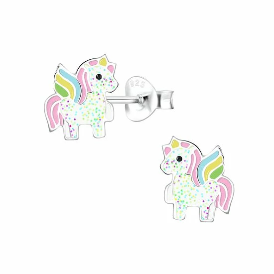 Zilveren oorstekers, eenhoorn met pastelkleurige glitters en manen